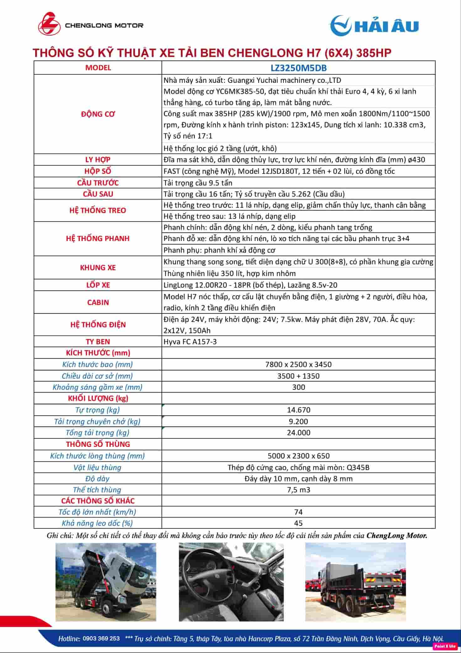 Hộp số thương hiệu Fast – công nghệ Mỹ, 12 số tiến, 2 số lùi có đồng tốc, lốp xe thương hiệu Linglong 12.00R20 – 18PR (bố thép), khả năng tải trọng của xe tải ben Chenglong LZ3250M5DB lên tới 28 tấn.